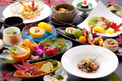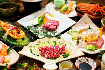 地元の旬な食材を使った豪華な会席料理が宿の自慢です。〝食して元気〝をテーマに、板前が海と山の幸を取り入れ創作しており、肉会席、海鮮会席、そして両方が揃った特別会席などがございます。 伊勢海老や旬のお造りがついた海鮮会席、馬刺し。料理は、ラインアップが充実しております。見た目にも美しく品数が豊富な旅館でしか味わえない料理を堪能いただけます。